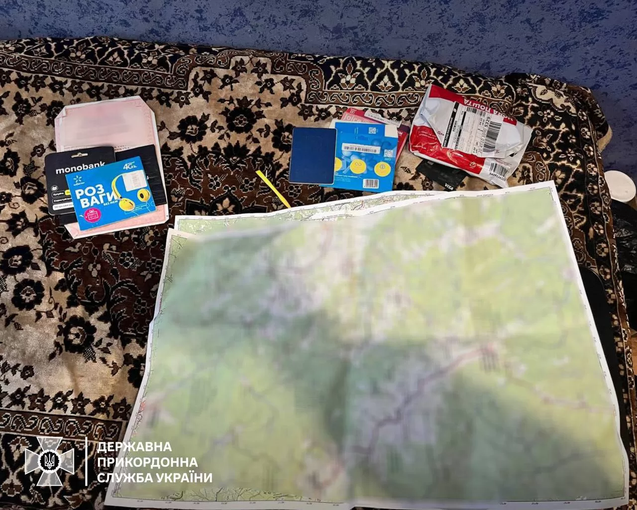 Під час обшуків у підозрюваного вилучили паперові карти Закарпатської області з нанесеними маршрутами незаконного перетину кордону, чорнові записи, а також ноутбук із даними про осіб, які планували втечу.