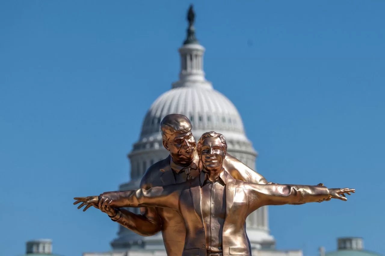 У Вашингтоні на Національній алеї встановили сатиричну статую, яка зображує Дональда Трампа та Джефрі Епштейна у сцені з фільму “Титанік” та висміює їхні минулі зв’язки. Інсталяція стала черговою роботою анонімних художників The Secret Handshake.