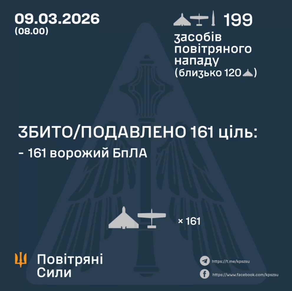 У ніч на 9 березня російські війська атакували Україну балістичними ракетами та майже двома сотнями ударних безпілотників. Сили протиповітряної оборони знешкодили 161 російський дрон.