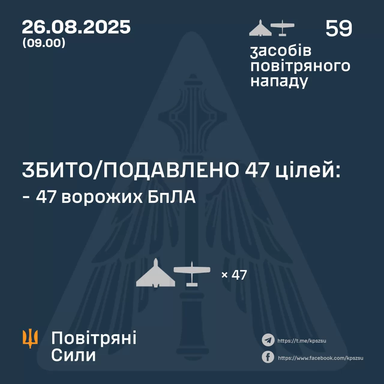 У ніч на 26 серпня, починаючи з 19:00 25 серпня, росіяни атакували Україну 59 ударними БпЛА Shahed і безпілотниками-імітаторами різних типів із напрямків: Курськ, Шаталово, Брянськ, Приморсько-Ахтарськ.