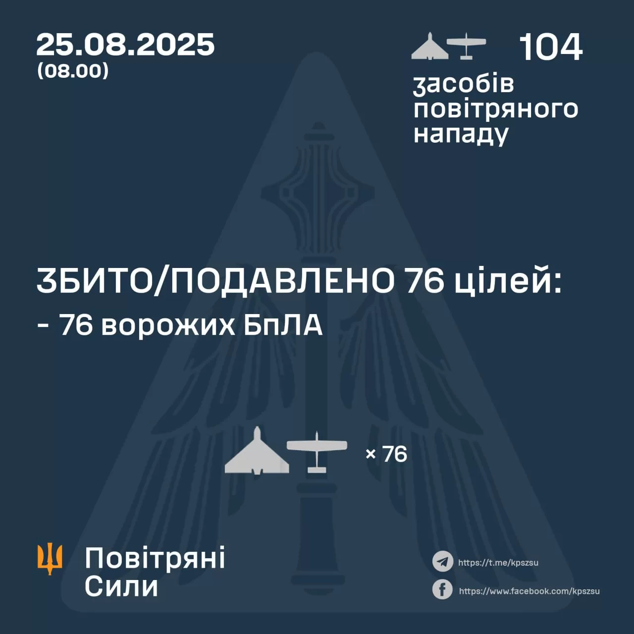 У ніч на 25 серпня, починаючи з 19:00 24 серпня, РФ запустила по Україні 104 ударні БпЛА Shahed і безпілотники-імітатори різних типів із напрямків: Курськ, Шаталово, Орел, Міллерово, Приморсько-Ахтарськ.
