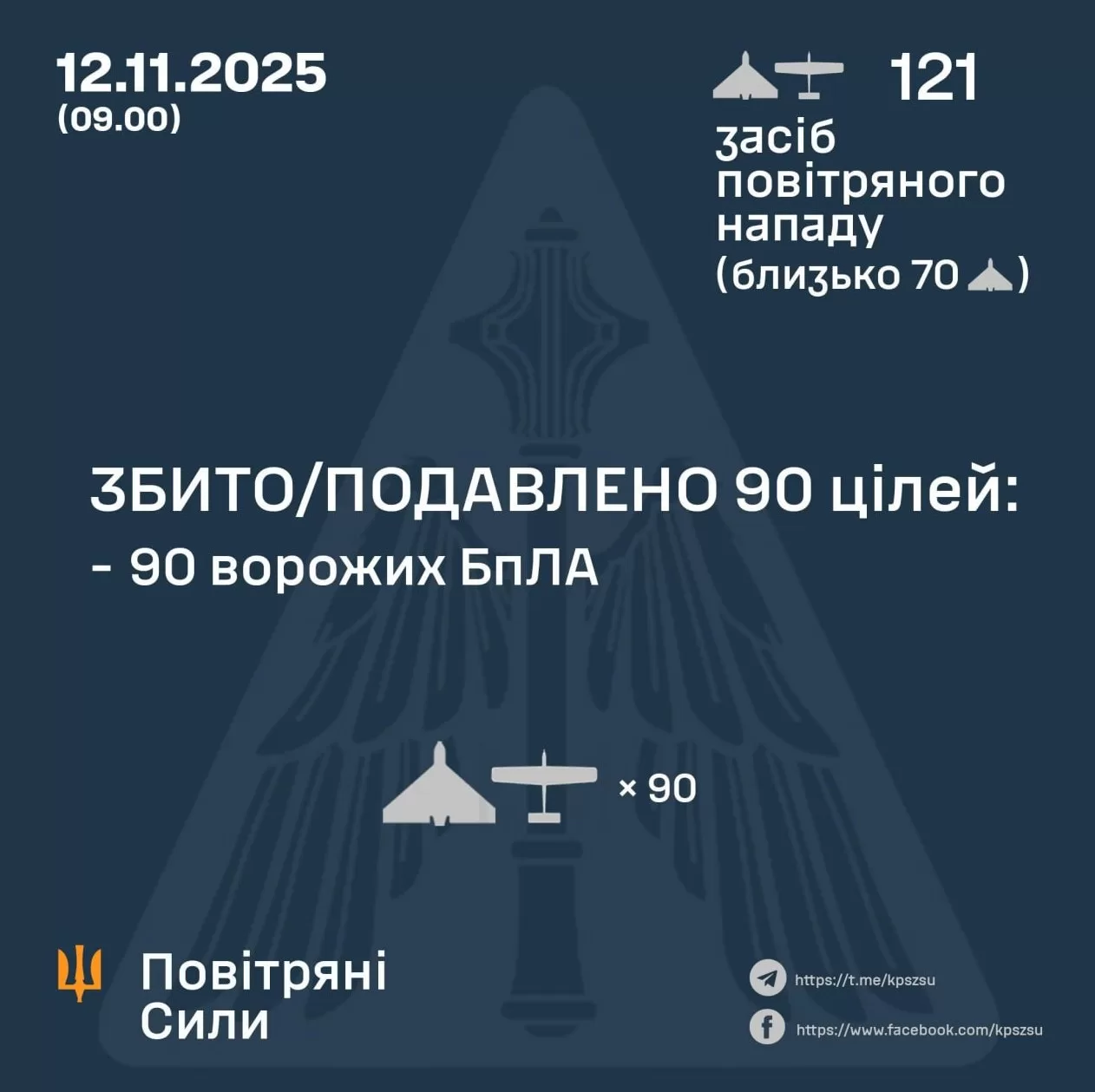 У ніч на 12 листопада Росія атакувала Україну 121 ударним безпілотником типів Shahed, «Гербера» та інших, повідомили в Повітряних силах ЗСУ. Атака здійснювалася з напрямків Міллерове, Орел, Приморсько-Ахтарськ (рф), а також із тимчасово окупованого Криму — районів Чауда і Гвардійське.
