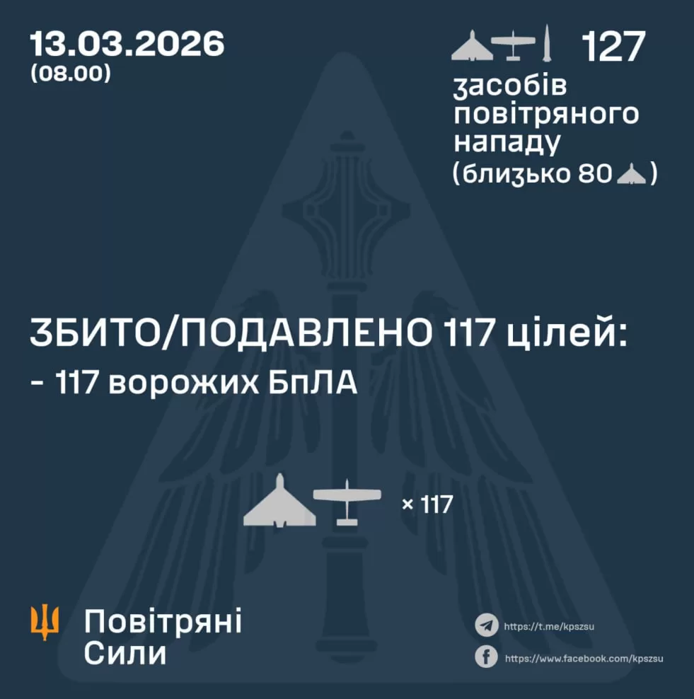 У ніч на 13 березня російські війська атакували Україну балістичною ракетою “Іскандер-М” та 126 ударними безпілотниками різних типів. Сили протиповітряної оборони збили або подавили 117 російських БпЛА.