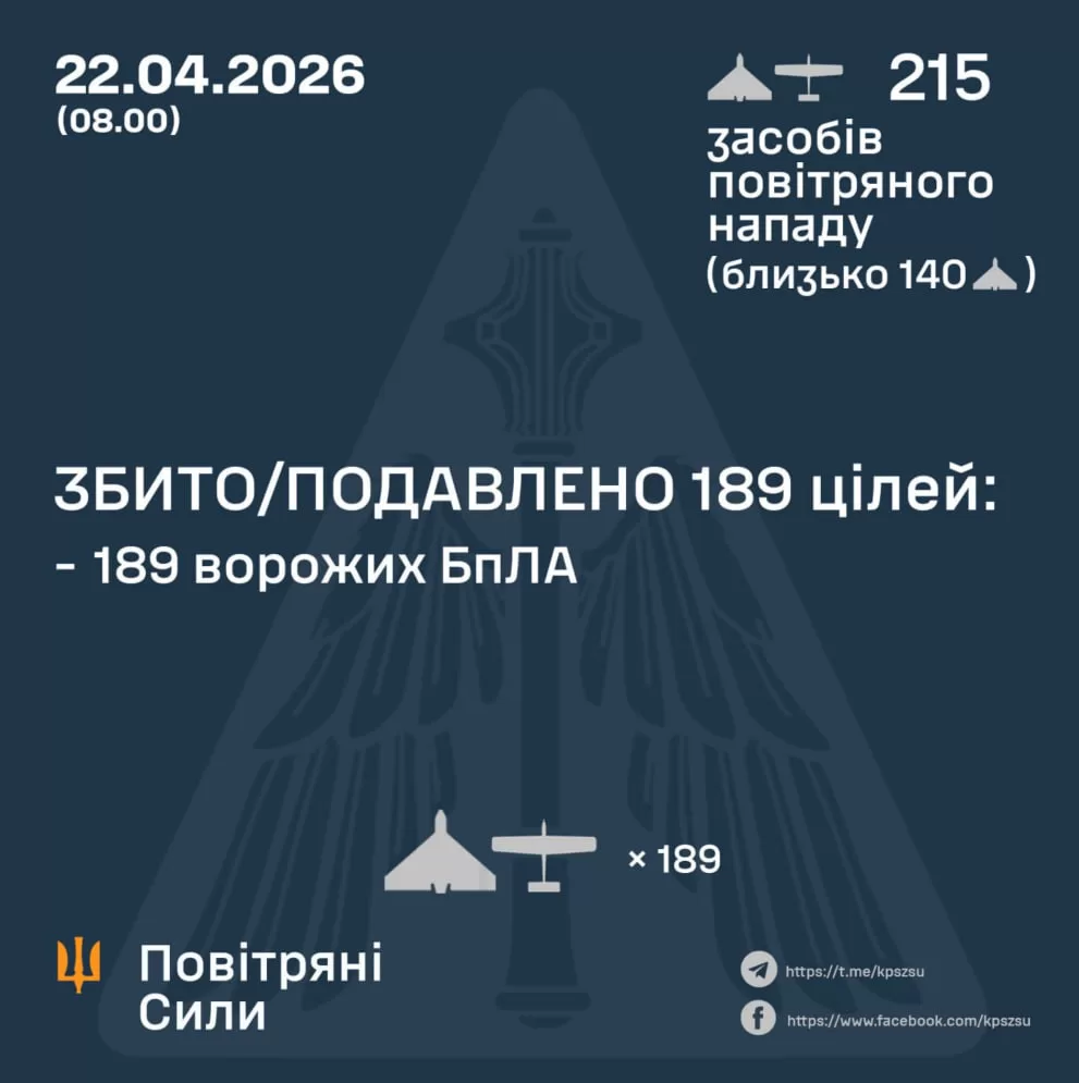 У ніч на 22 квітня російські війська здійснили масовану атаку на Україну 215 безпілотниками різних типів. Сили ППО збили або подавили 189 дронів, однак зафіксовані влучання.