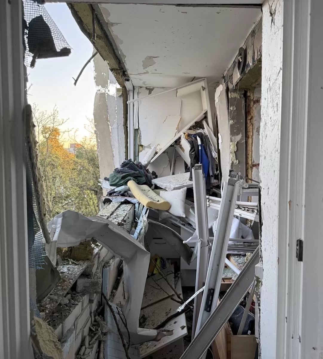 “Сьогодні російська балістика рознесла нашу квартиру. Всередині все розтрощене, вибуховою хвилею вигнуло і вирвало із замків броньовані двері. Залишилися стіни, та й ті частково зруйновані. Нам пощастило, всі в родині живі”, – написав він.