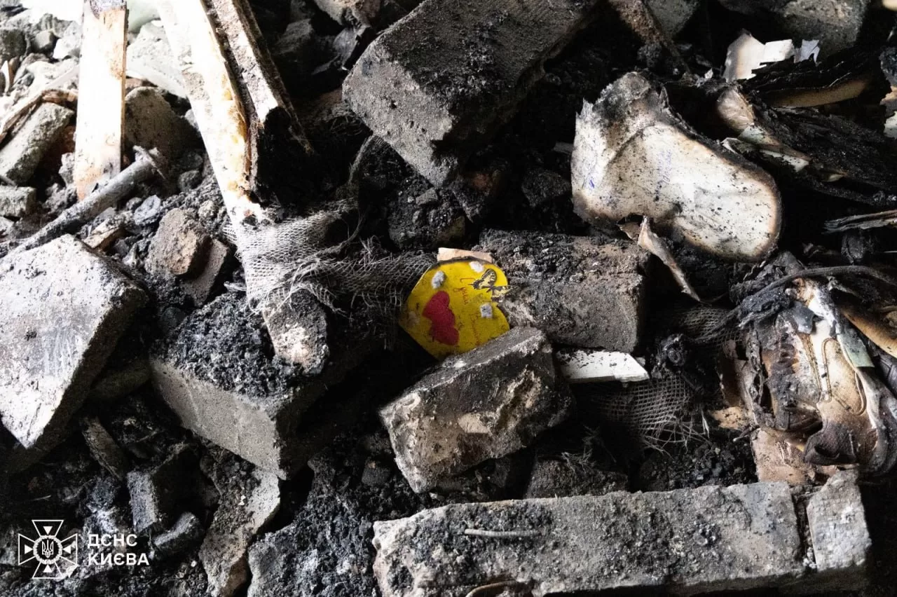 У Дарницькому районі після влучання в багатоповерхівку загорілися верхні поверхи та автомобілі. Під час повторного обстрілу зазнали поранень п’ятеро рятувальників.