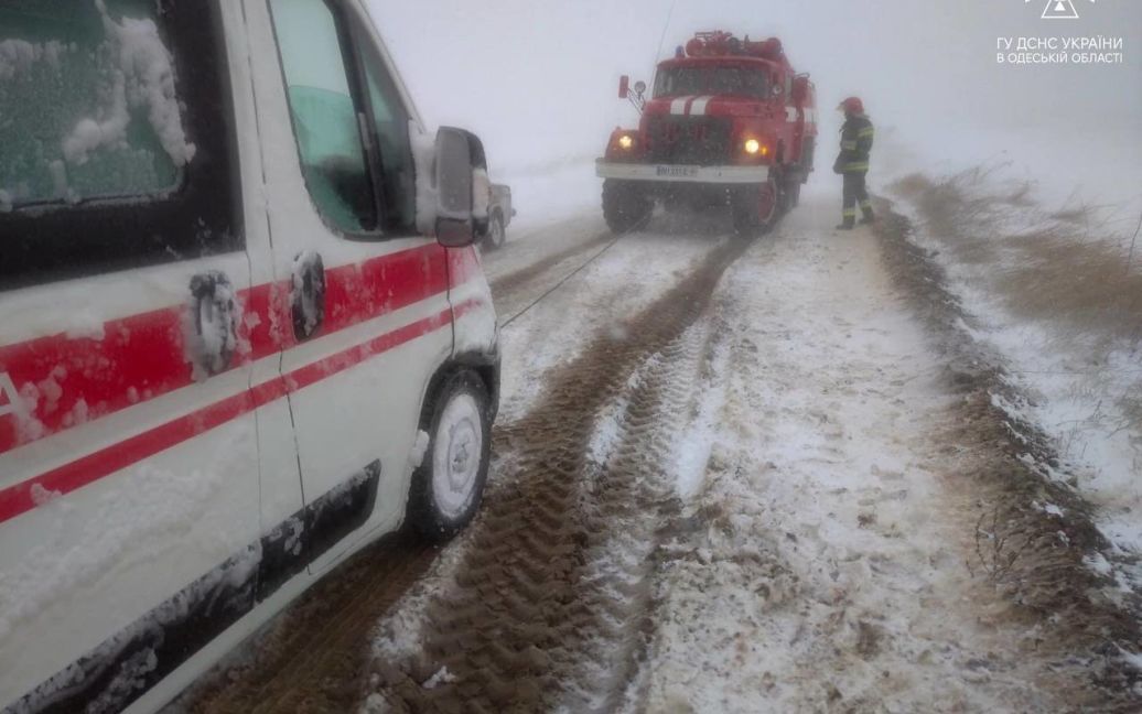У Білгород-Дністровському районі зі снігового замету витягли автомобіль швидкої допомоги і супроводжують його до місця виклику.