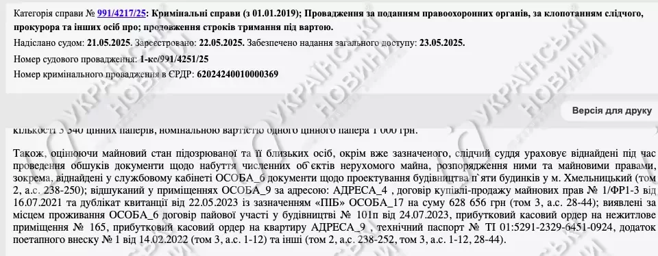 Суд, оцінюючи майновий стан Тетяни Крупи та її родичів, взяв до уваги матеріали НАБУ, зібрані під час обшуків. Зокрема, у службовому кабінеті Крупи знайшли документи, пов’язані з проєктуванням п’яти будинків у Хмельницькому, а за місцем проживання – угоди про купівлю-продаж майнових прав, пайову участь у будівництві, касові ордери на квартиру й нежитлове приміщення та інші документи щодо нерухомості.