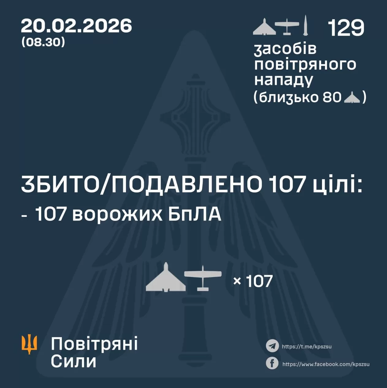 У ніч на 20 лютого противник атакував Україну однією балістичною ракетою «Іскандер-М» із Ростовської області РФ та 128 ударними безпілотниками типу Shahed, «Гербера», «Італмас» і дронами інших типів. Про це повідомили Повітряні сили ЗСУ.