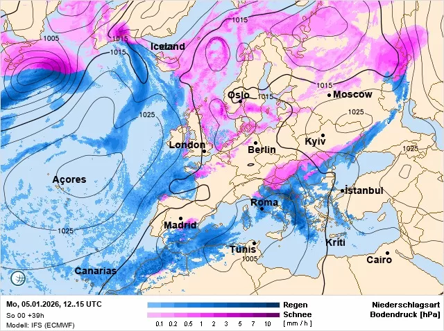 За її словами, над Європою простягається смуга високого атмосферного тиску від Португалії та Іспанії через Німеччину і Польщу до України, що означає переважно суху погоду. Водночас північніше та південніше цієї зони активні циклони з атмосферними фронтами, які приносять опади у вигляді снігу або дощу залежно від температури повітря.