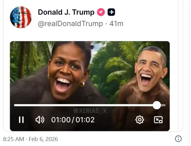 Расистське відео, у якому колишній президент Барак Обама та колишня перша леді Мішель Обама зображені як мавпи в джунглях, президент США опублікував увечері 5 лютого у власній соцмережі Truth Social. Через кілька годин на тлі масового обурення, зокрема з боку близького союзника, ролик було видалено.