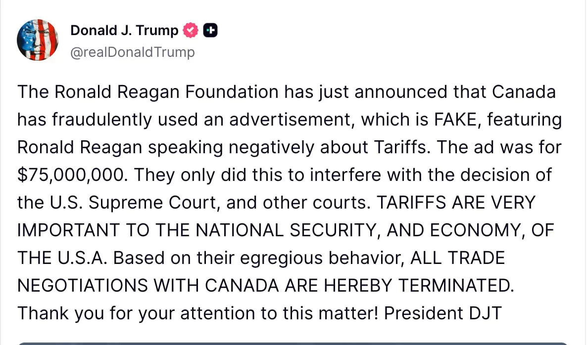 «Фонд Рональда Рейгана щойно повідомив, що Канада шахрайськи використала рекламу, у якій Рейган негативно висловлюється про тарифи. Вони зробили це, щоб вплинути на судові рішення. Тарифи є дуже важливими для національної безпеки та економіки США. Всі торговельні переговори з Канадою припиняються», — написав Трамп.