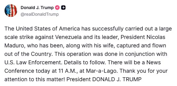 Про це Трамп написав у дописі в соцмережі Truth Social. За його словами, операцію було проведено у взаємодії з американськими правоохоронними органами, а захоплених осіб вивезли за межі Венесуели. Він також повідомив, що деталі операції буде оголошено під час пресконференції, запланованої на 11:00 у Мар-а-Лаго.