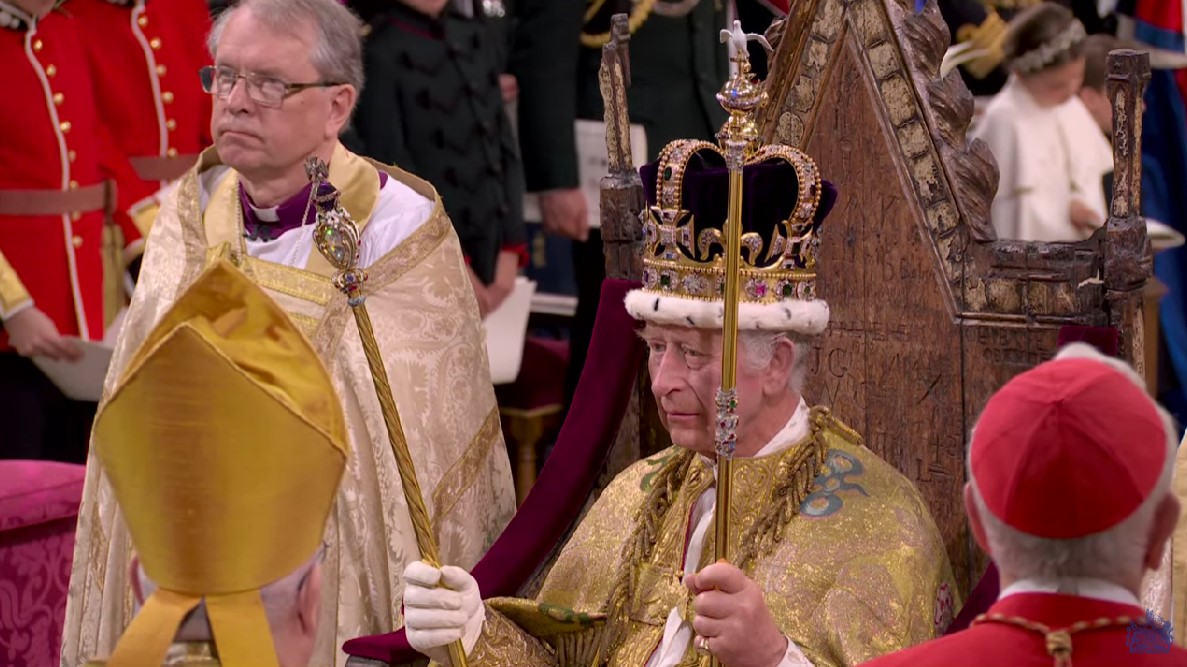 Архієпископ Кентерберійський виконав ритуал помазання. Чарльза ІІІ одягли у священні ризи і вручили символи монархії; кулю, перстень та скіпетри. Після цього архієпископ Кентерберійський поклав корону на голову нового монарха Британії.