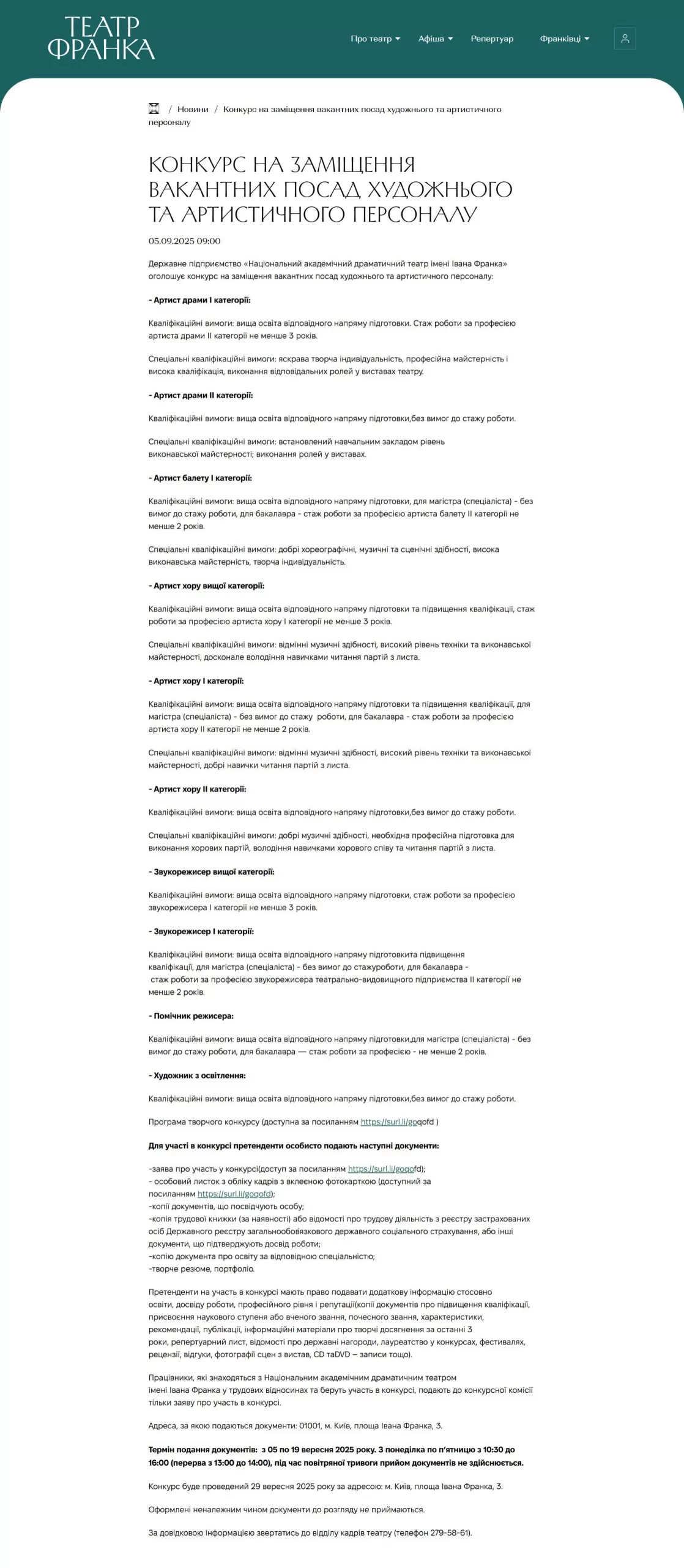 У Національному академічному драматичному театрі імені Івана Франка в Києві під час конкурсу на заміщення вакантних посад один із конкурсантів розбив скляну пляшку та почав погрожувати завдати собі травму уламком скла.