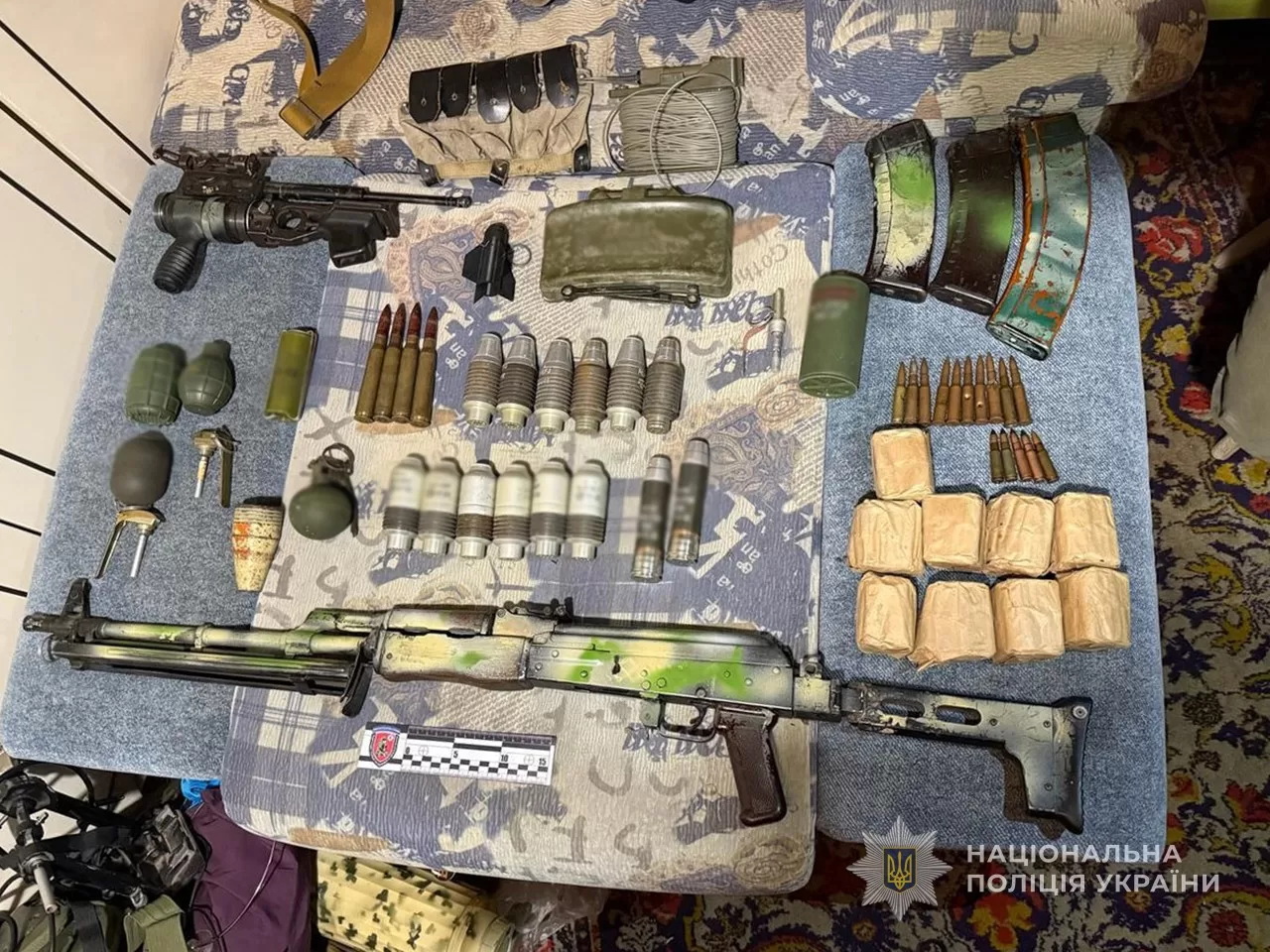Того ж дня за місцем його мешкання провели обшук, у ході якого виявили кулемет, гранатомет із 14 пострілами, шість гранат, чотири підривачі, протипіхотну міну, підривну магістраль, майже 400 набоїв та орден із нацистською символікою. Усе вилучене направили на експертизу.