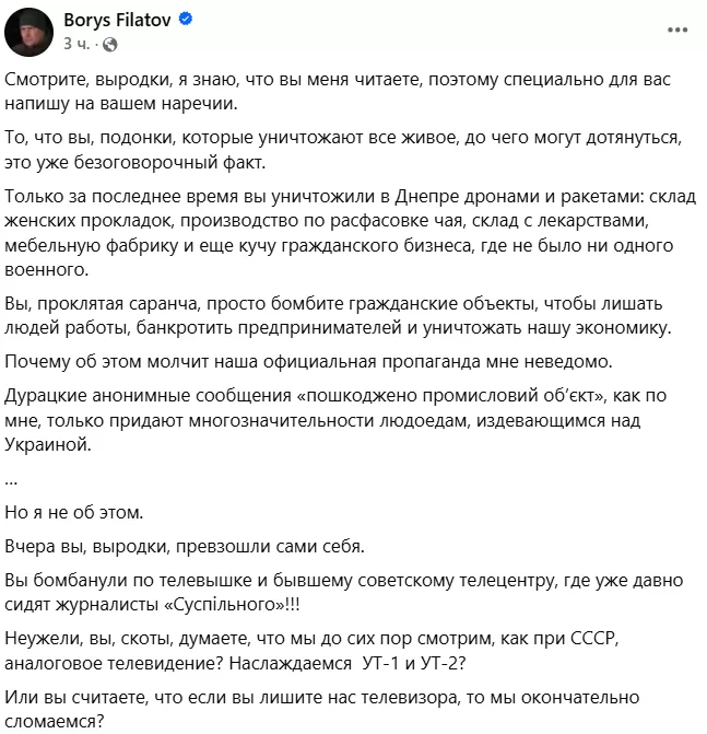 “Тільки за останній час ви знищили в Дніпрі дронами і ракетами: склад жіночих прокладок, виробництво з розфасовки чаю, склад з ліками, меблеву фабрику і ще купу цивільного бізнесу, де не було жодного військового. Ви, клята сарана, просто бомбите цивільні об’єкти, щоб позбавляти людей роботи, банкрутувати підприємців і знищувати нашу економіку”, – написав Філатов.
