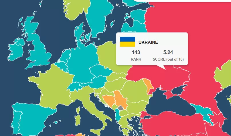 У тому ж рейтингу сусідні країни мають значно кращі результати: Молдова – 85-е місце, Польща – 76-е, Словаччина – 49-е, Румунія – 50-е. Росія опустилася на 148-му позицію, тоді як Білорусь – на 122-й.