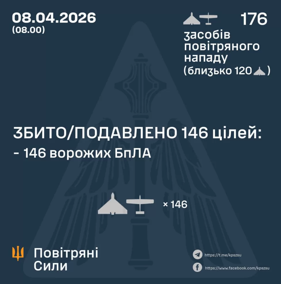 У ніч на 8 квітня російські війська атакували Україну 176 ударними безпілотниками. Сили ППО знищили або подавили 146 із них.