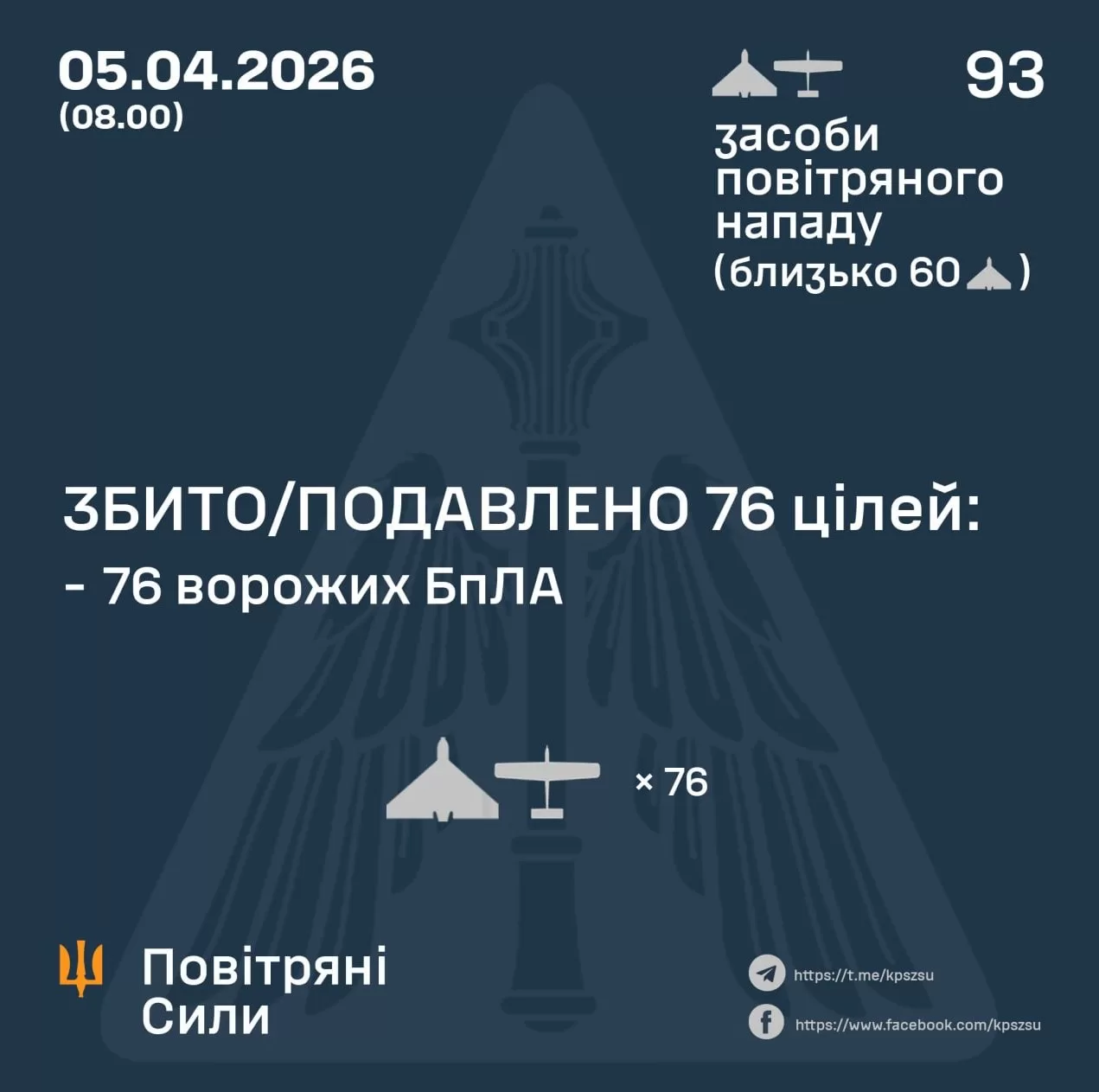 Станом на 08:00 підтверджено збиття або придушення 76 ворожих безпілотників на півночі, півдні та сході країни.