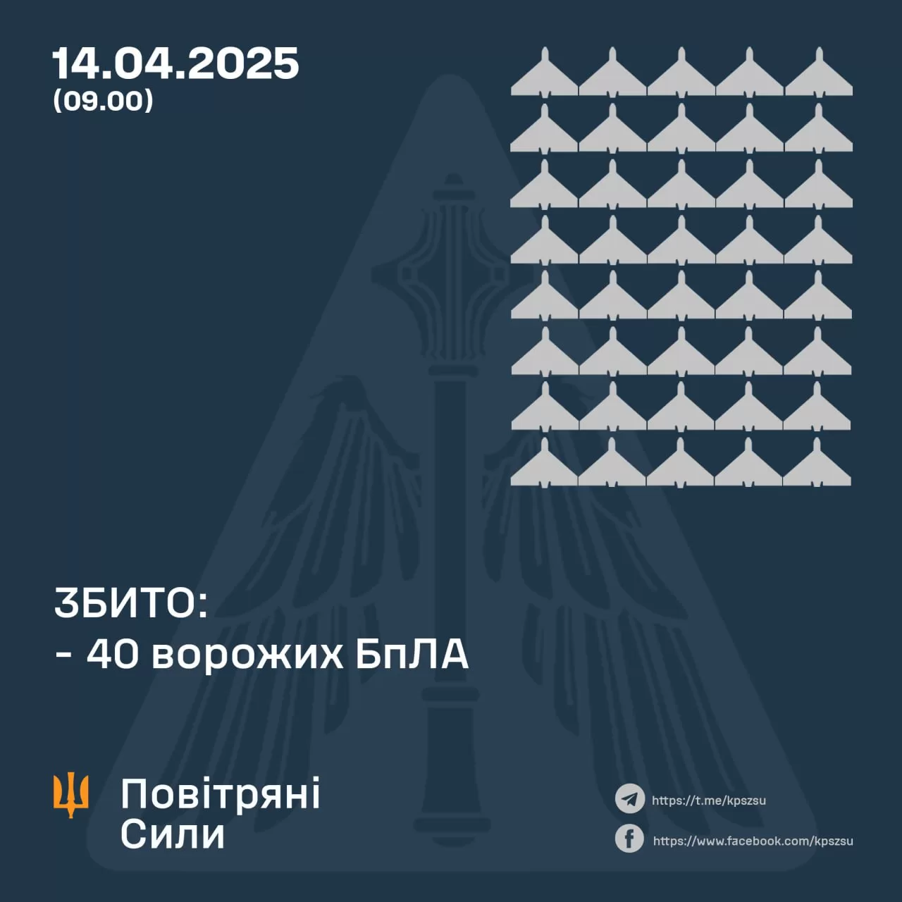 Станом на 09.00 підтверджено збиття 40 ударних БпЛА типу Shahed (безпілотників інших типів) на сході та півдні країни.