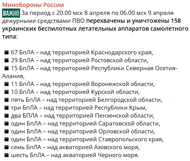 У ніч з 8 на 9 квітня на території понад десяти регіонів Росії зафіксовано масовану атаку безпілотників. Повідомляється про удари по військових аеродромах у Моздоку та Оренбурзькій області, промислових зонах та арсеналу ракетного озброєння.