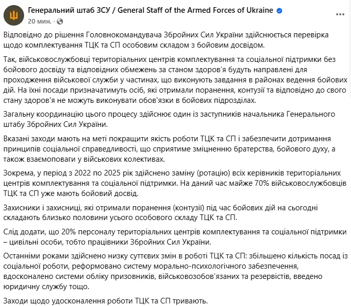 За даними Генштабі, у період з 2022 по 2025 рік здійснено заміну (ротацію) всіх керівників територіальних центрів комплектування та соціальної підтримки. На даний час майже 70% військовослужбовців ТЦК та СП уже мають бойовий досвід.