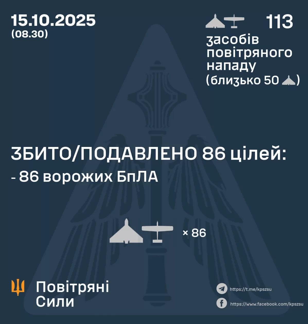 У ніч на 15 жовтня Росія здійснила одну з наймасштабніших атак безпілотниками, випустивши 113 ударних дронів із різних напрямків. Сили протиповітряної оборони України збили або придушили 86 із них.