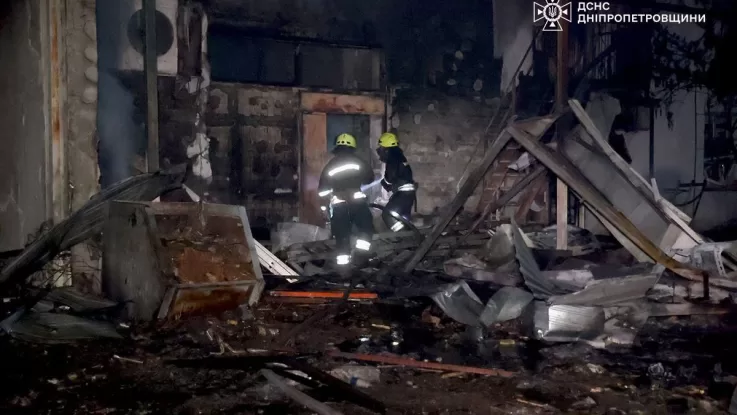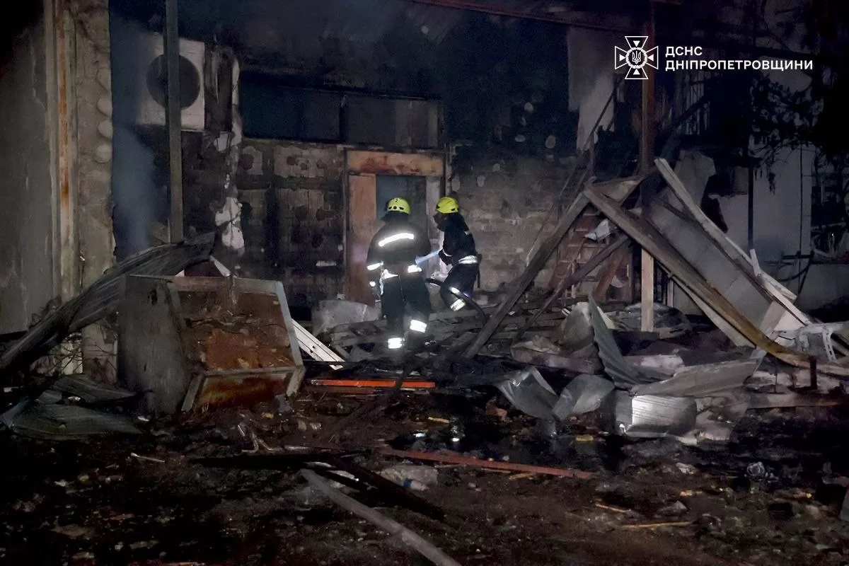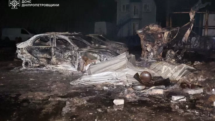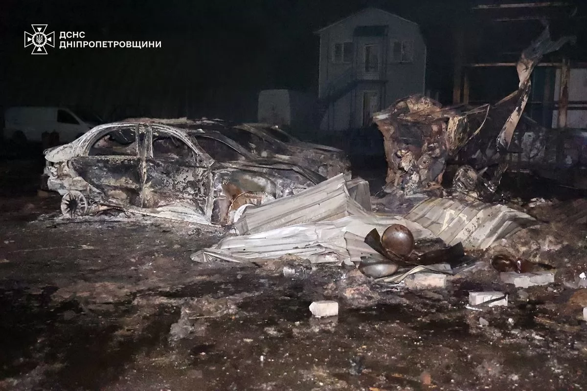 - У Дніпрі поранення дістали четверо осіб, двох із них госпіталізували — 43-річного чоловіка та 69-річну жінку. Постраждала адмінбудівля, згоріло 12 автівок, ще 17 пошкоджені. Руйнувань зазнали вісім будинків, одну приватну оселю знищено. Також є пошкодження на території транспортного підприємства.