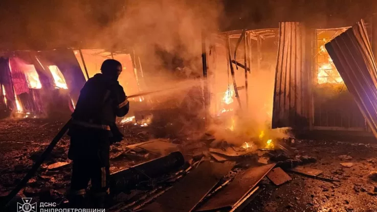 БпЛА також уразили Павлоград — там спалахнули пожежі, постраждали приватні підприємства й автомобілі. На Нікопольщині ворог застосував артилерію та FPV-дрон, поціливши по райцентру та Покровській громаді, де горів приватний будинок. За даними ПвК, сили ППО знищили в області вісім безпілотників.
