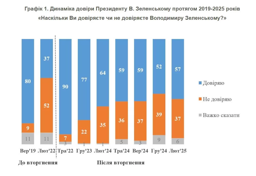 За даними КМІС, на першу половину лютого 2025 року 57% українців довіряють Зеленському, 37% — ні. Баланс довіри-недовіри становить +20%.