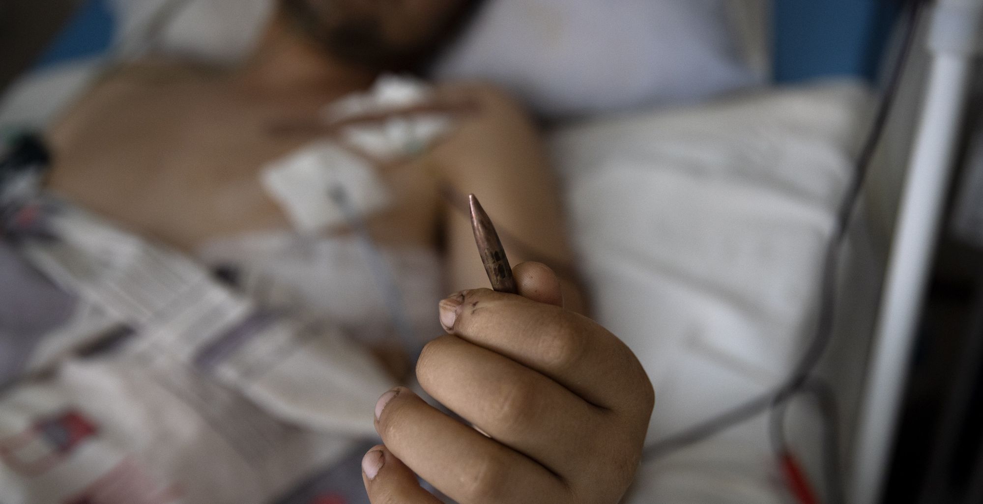 Один український військовий лежав у своєму ліжку, стискаючи російську кулю, яку щойно витягли з його тіла після того, як вона пройшла через ліве плече та вийшла через таз. Його підстрелили, коли він лежав на землі, шукаючи прикриття від російської атаки в селі.