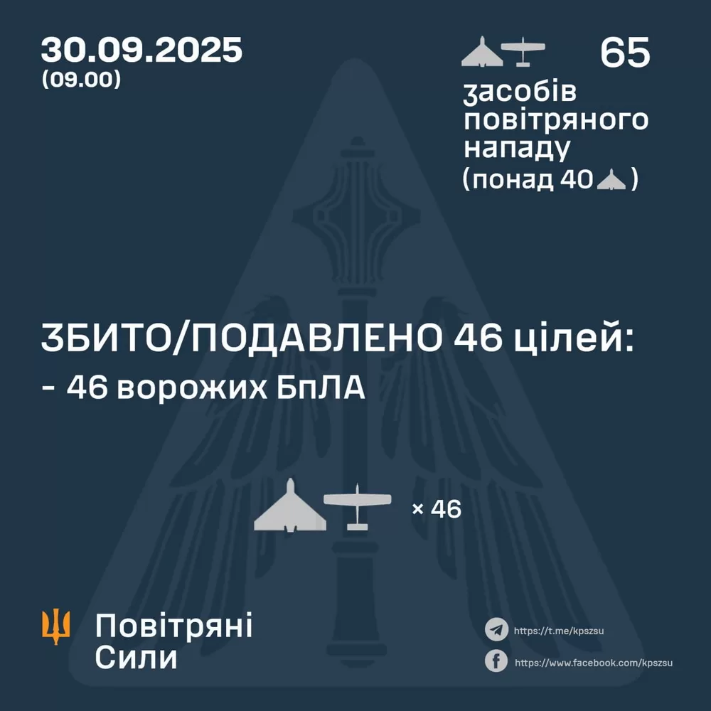 У ніч на 30 вересня російські війська атакували Україну 65 ударними безпілотниками типу Shahed, «Гербера» та іншими дронами. За повідомленням Повітряних Сил ЗСУ, запуск здійснювався з території Брянської, Орловської, Курської областей РФ, а також із Міллерового, Приморсько-Ахтарська та тимчасово окупованого Криму (Чауда). Більше 40 апаратів становили «шахеди».