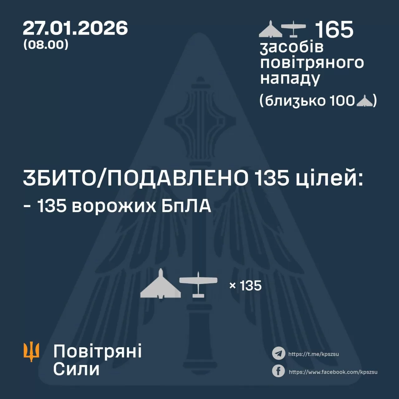 У ніч на 27 січня, починаючи з 18:00 26 січня, РФ атакувала Україну 165 ударними БпЛА Shahed (зокрема реактивними), “Гербера”, “Італмас” та дронами інших типів із напрямків: Курськ, Орел, Брянськ, Міллєрово, Приморсько-Ахтарськ; Гвардійське, Чауда (ТОТ АР Крим). Близько 100 із них – “шахеди”.
