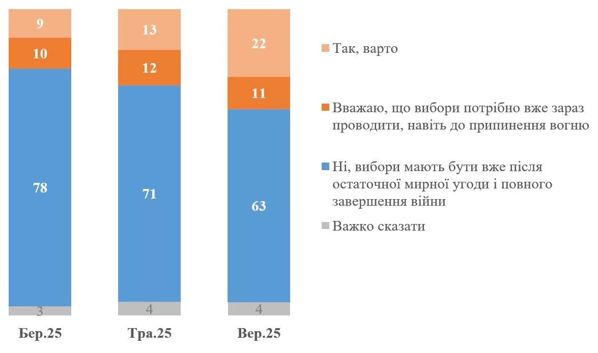 Водночас більшість — 63% — вважають, що голосування має відбутися лише після остаточної мирної угоди та завершення війни, тоді як у травні таких було 71%, а у березні — 78%.