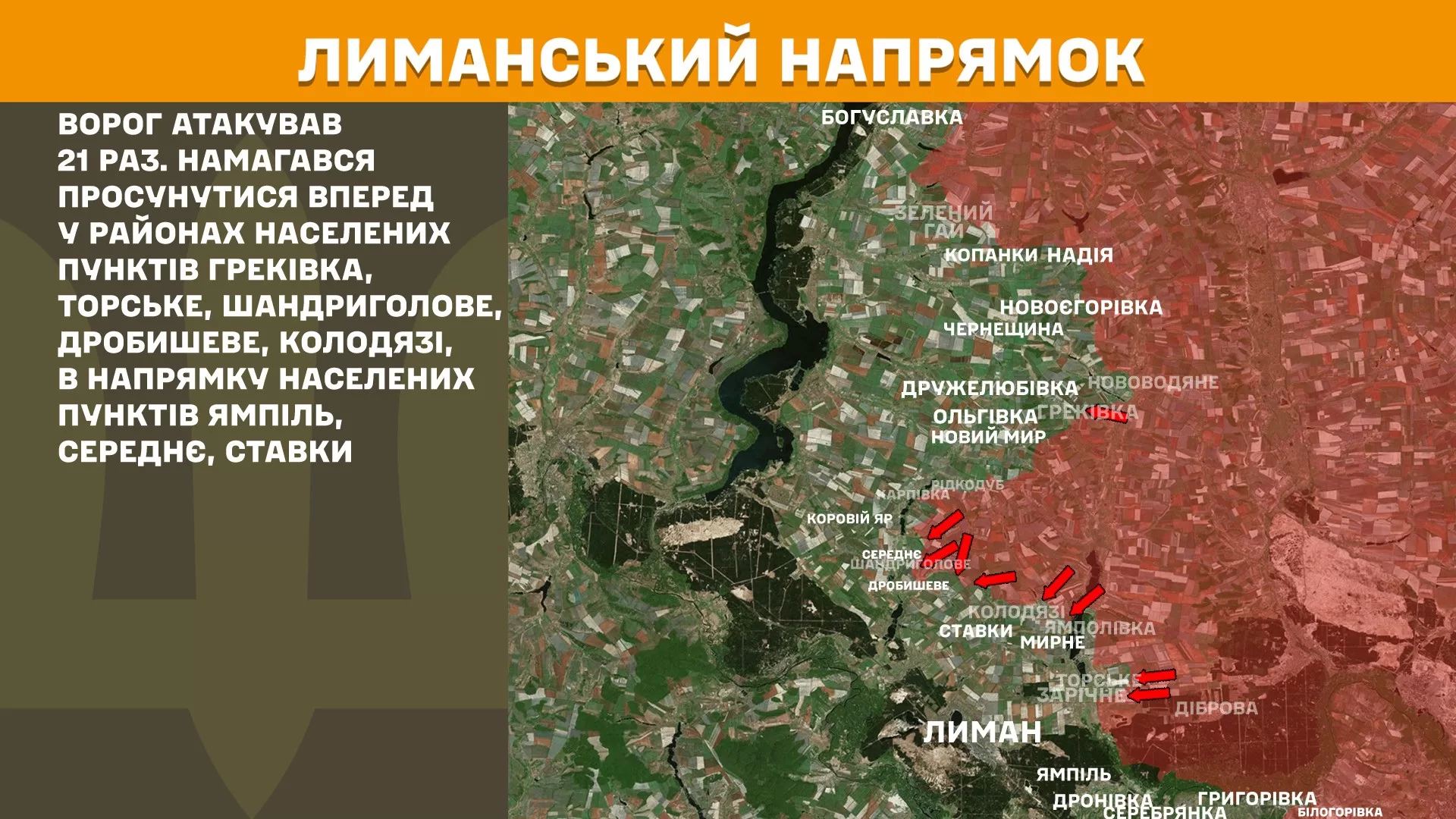 На Лиманському напрямку ворог атакував 21 раз. Намагався просунутися вперед у районах населених пунктів Греківка, Торське, Шандриголове, Дробишеве, Колодязі, в напрямку населених пунктів Ямпіль, Середнє, Ставки.