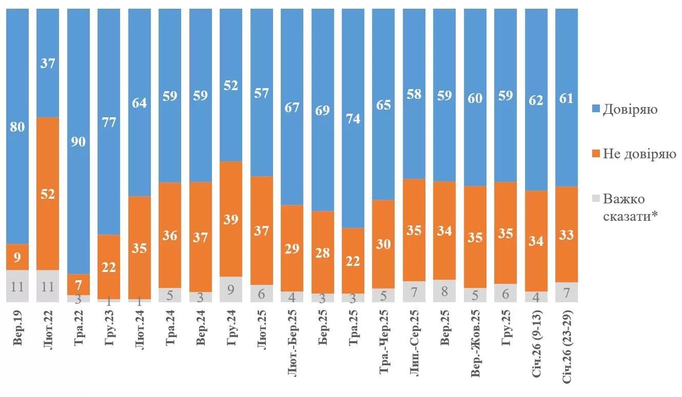Согласно результатам всеукраинского опроса, проведенного Киевским международным институтом социологии в период с 23 по 29 января 2026 года, 61% респондентов заявили, что доверяют президенту Владимиру Зеленскому, тогда как 33% сообщили о недоверии. Баланс доверия и недоверия составляет +28% и практически не изменился по сравнению с серединой января.