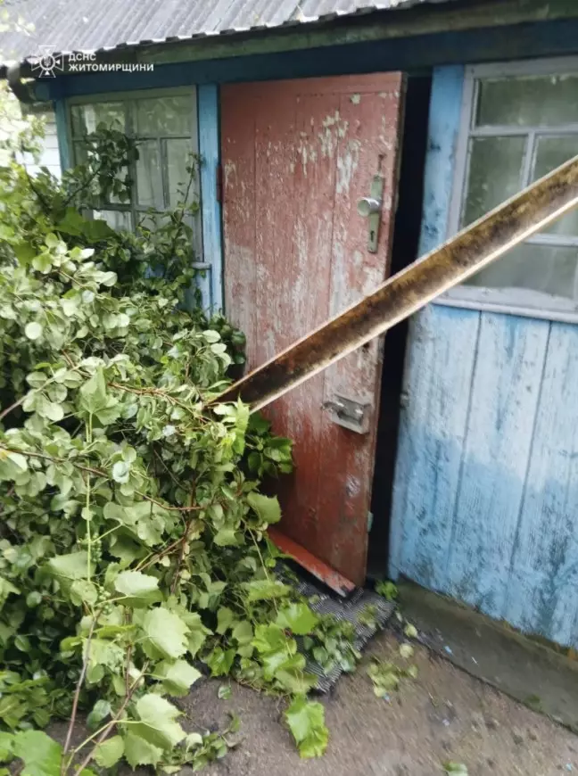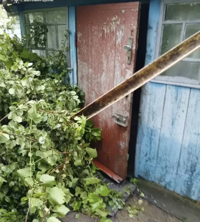 В селе Турчинка Коростенского района дерево упало на территорию частного домохозяйства и заблокировало вход в жилой дом. Спасатели с помощью специнструмента разрезали ствол и освободили проход.
