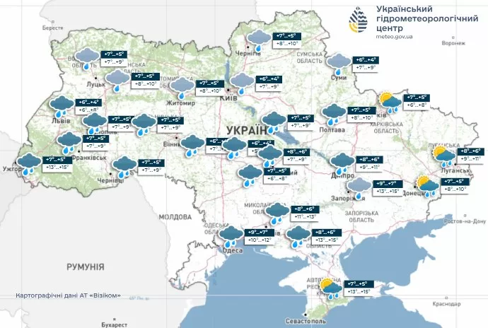 Температура ночью составит +3…+8 °C, днем +5…+10 °C. В Закарпатье и на юге воздух прогреется до +11…+16 °C, тогда как в горах Карпат ночью и днем ожидается около 0 °C.