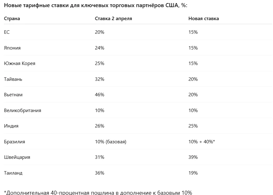 Трамп установил крайний срок — 1 августа — для заключения торговых соглашений, в противном случае страны столкнулись бы с повышенными тарифами. Это вызвало спешные переговоры между США и их партнерами.