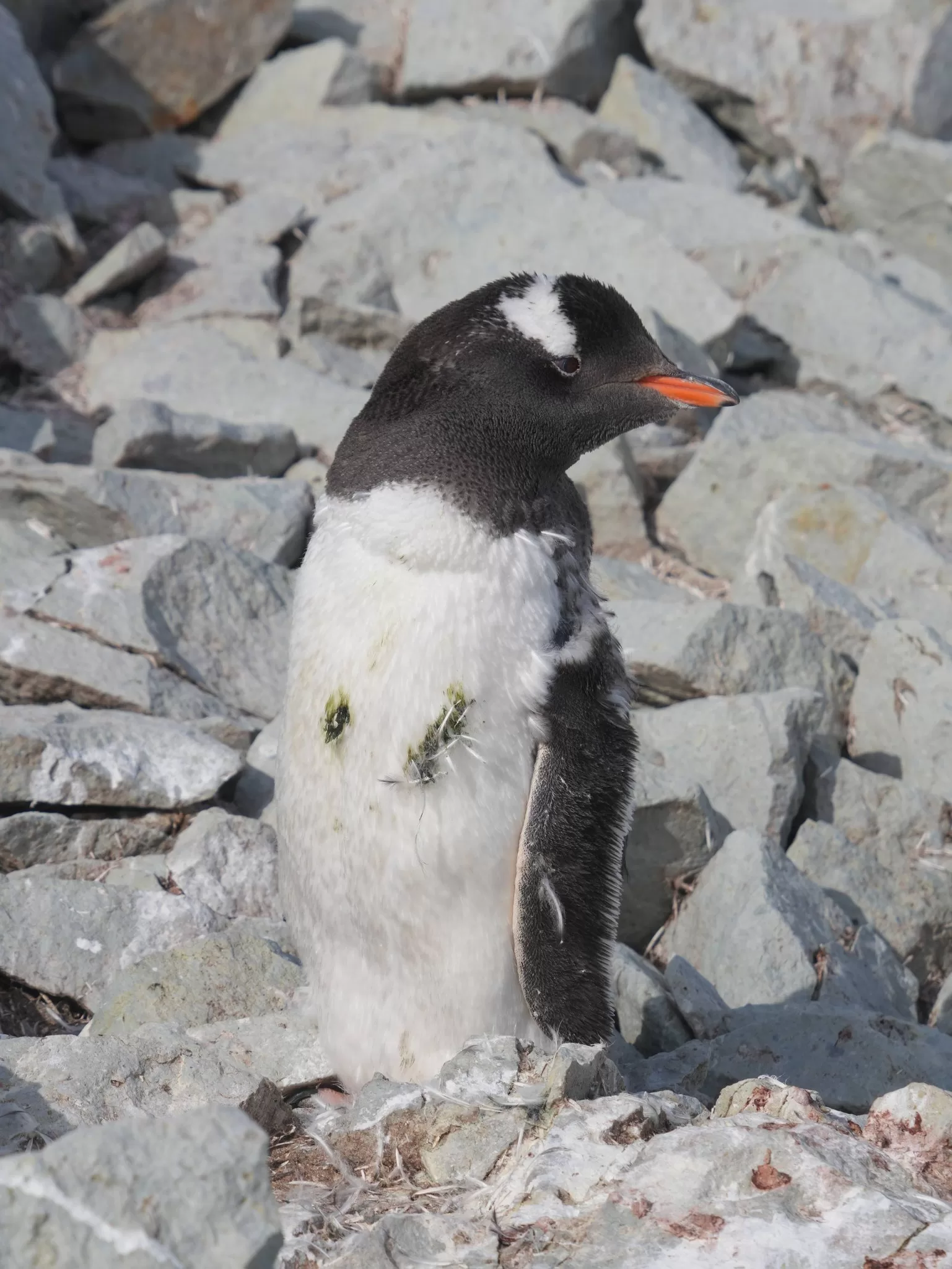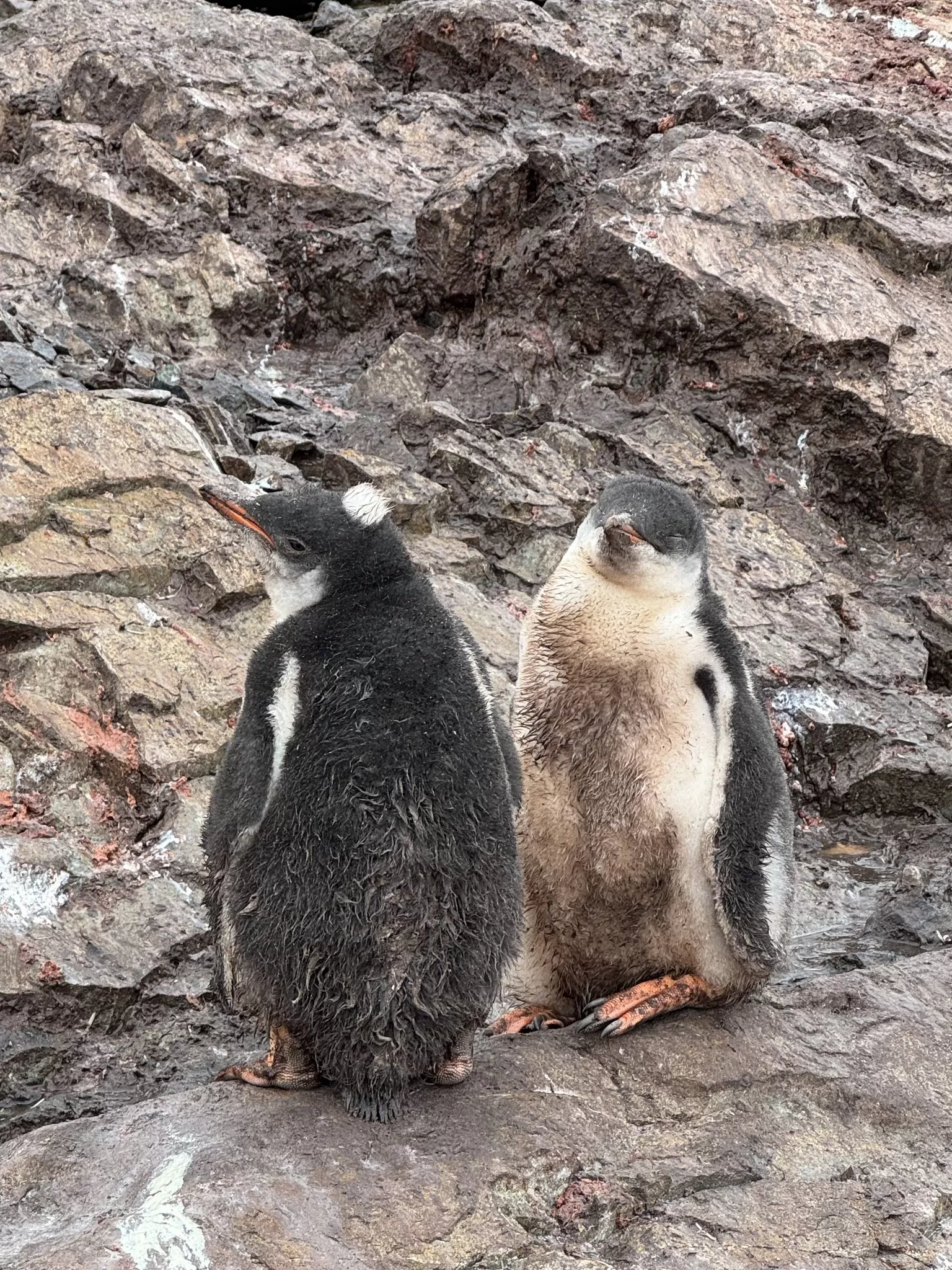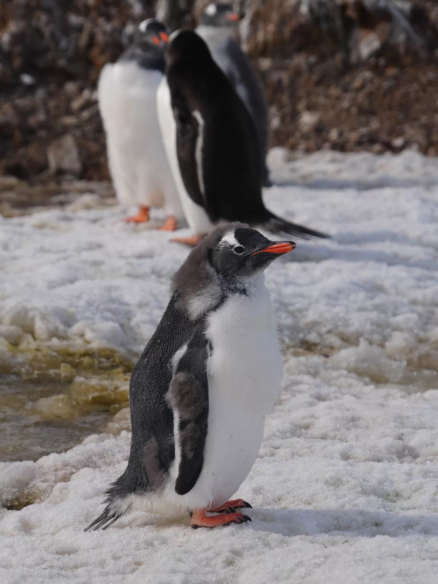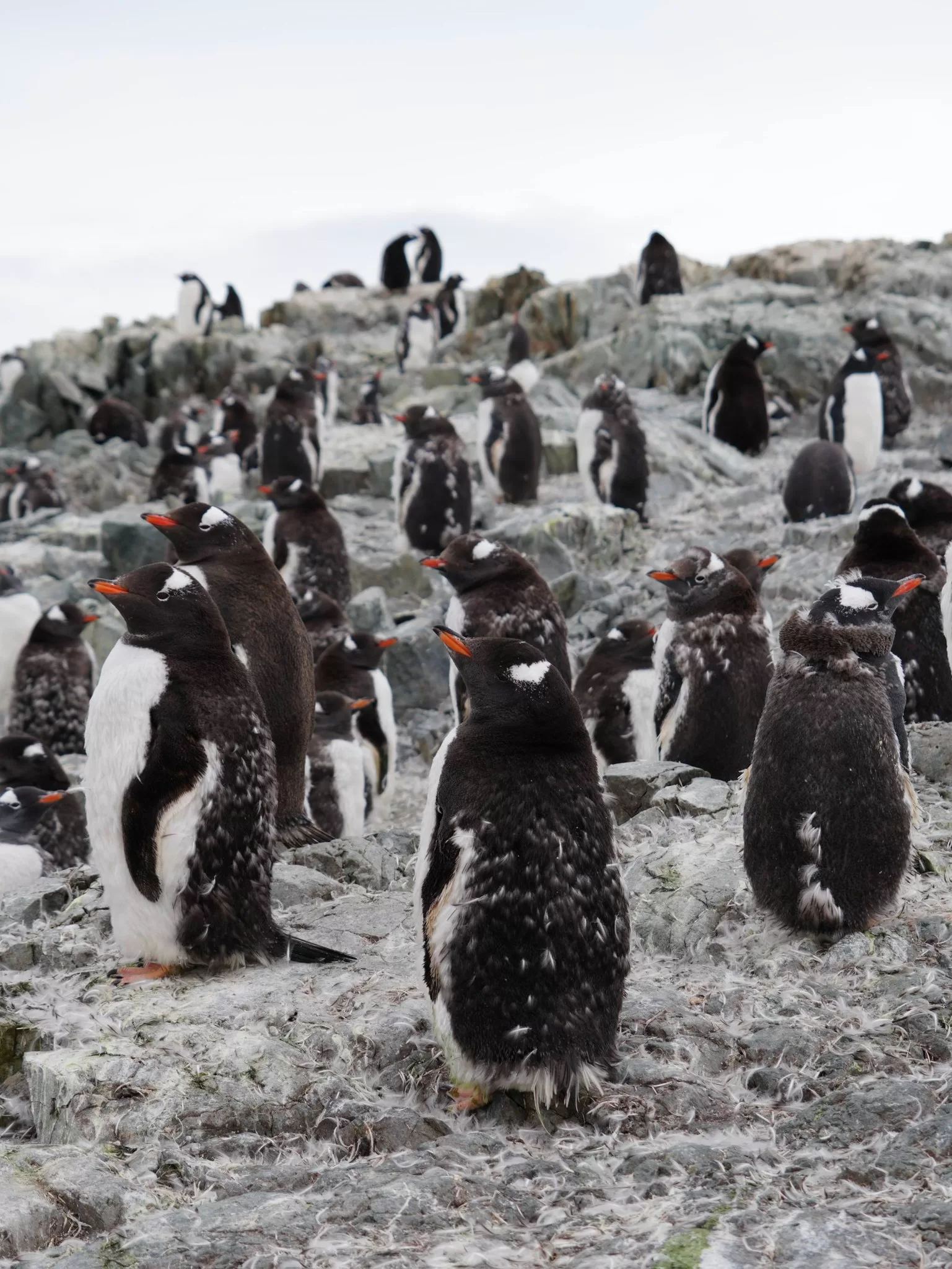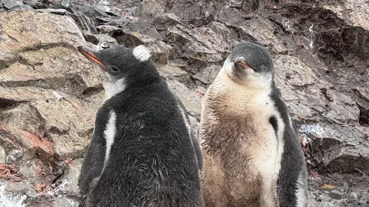В Антарктике завершается лето, снежный покров значительно растаял, а у пингвинов продолжается сезон линьки. Птенцы, родившиеся в этом сезоне, активно меняют первый пуховой наряд на перья. После завершения линьки они начнут плавать в океане и самостоятельно добывать пищу — до этого времени их кормят родители.