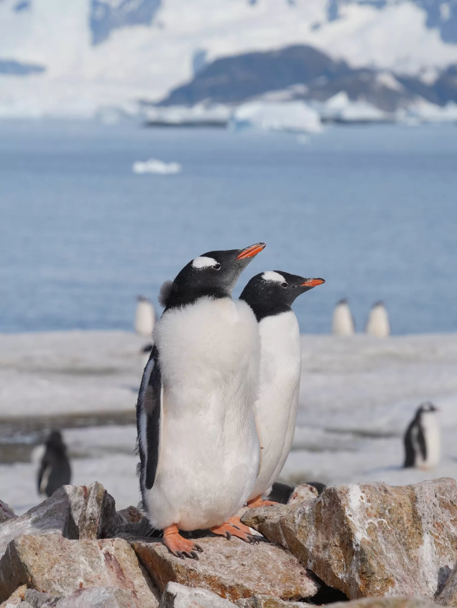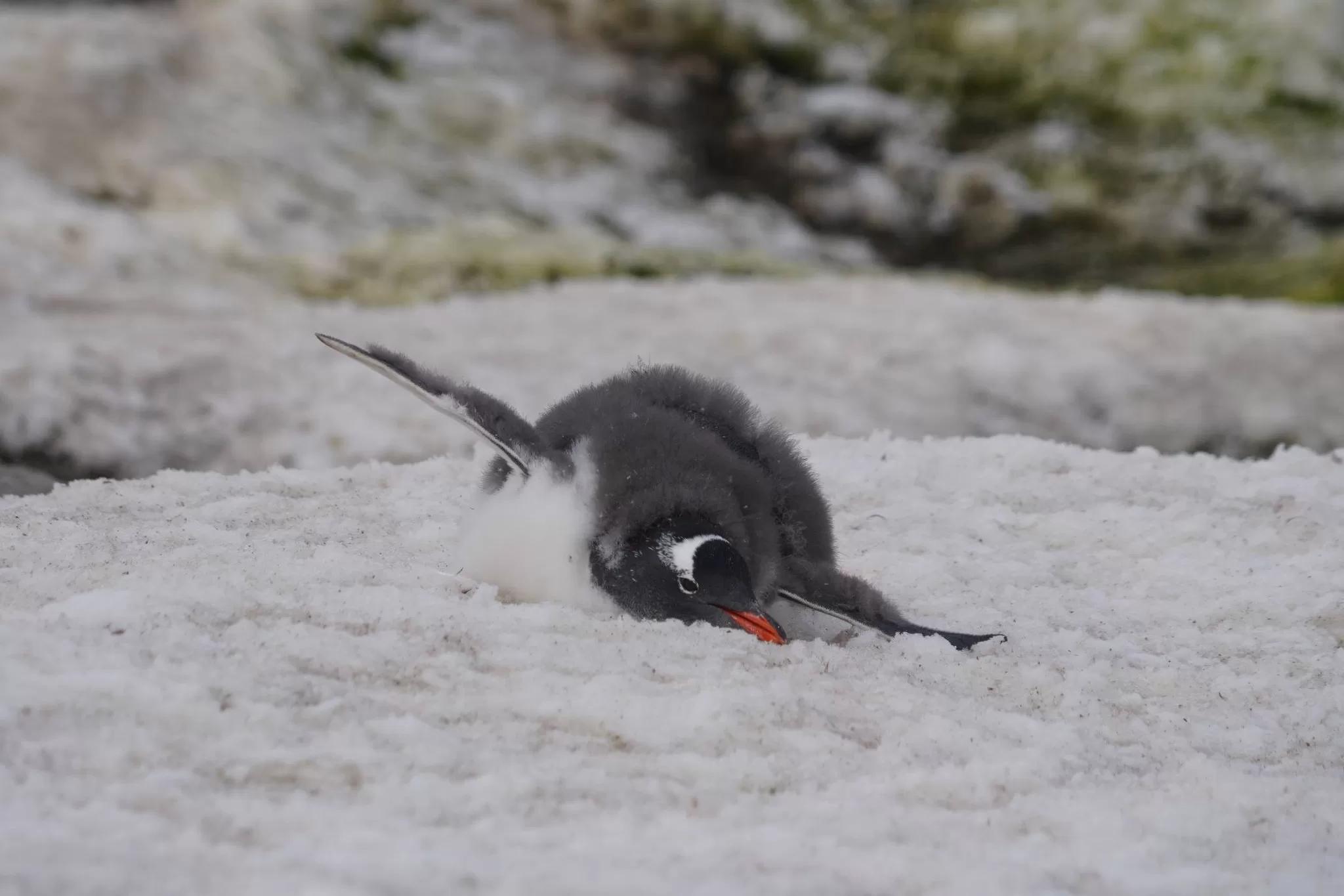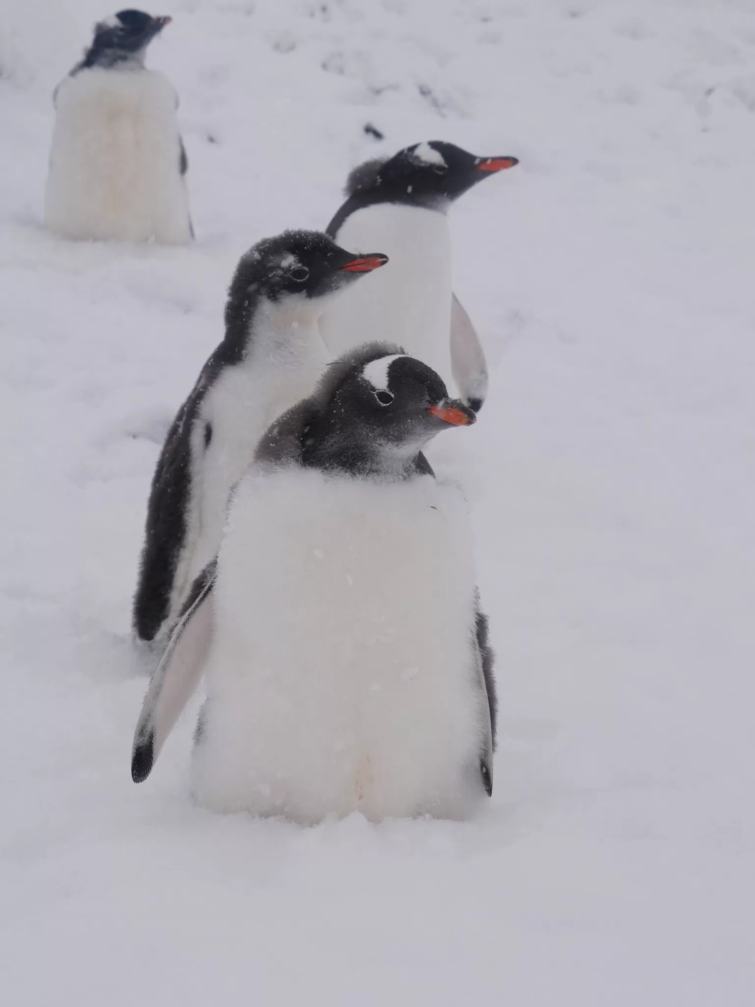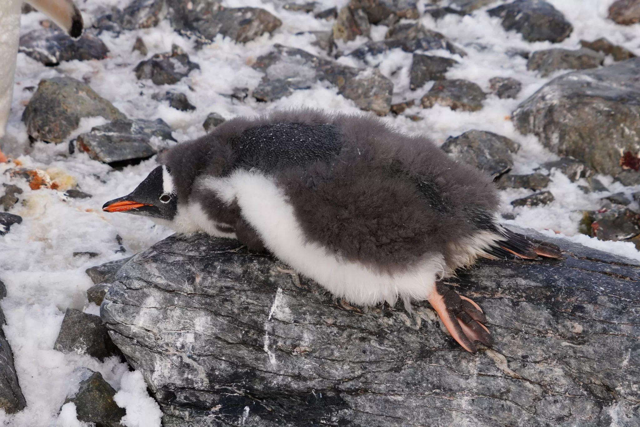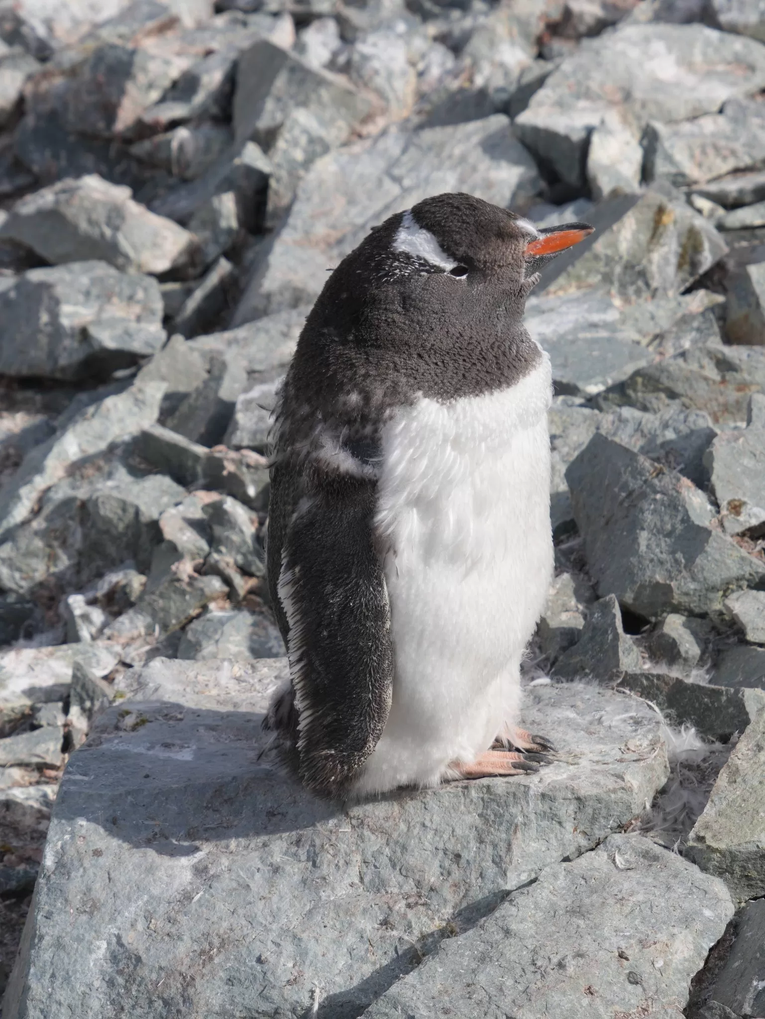 В Антарктике завершается лето, снежный покров значительно растаял, а у пингвинов продолжается сезон линьки. Птенцы, родившиеся в этом сезоне, активно меняют первый пуховой наряд на перья. После завершения линьки они начнут плавать в океане и самостоятельно добывать пищу — до этого времени их кормят родители.