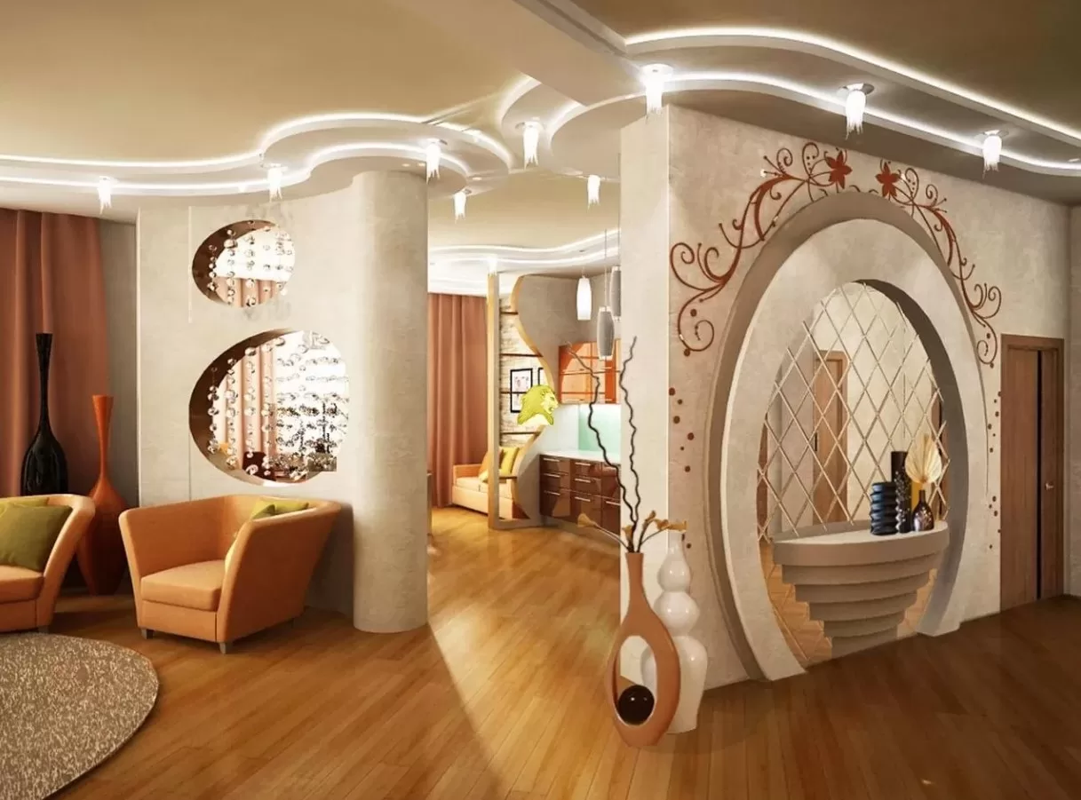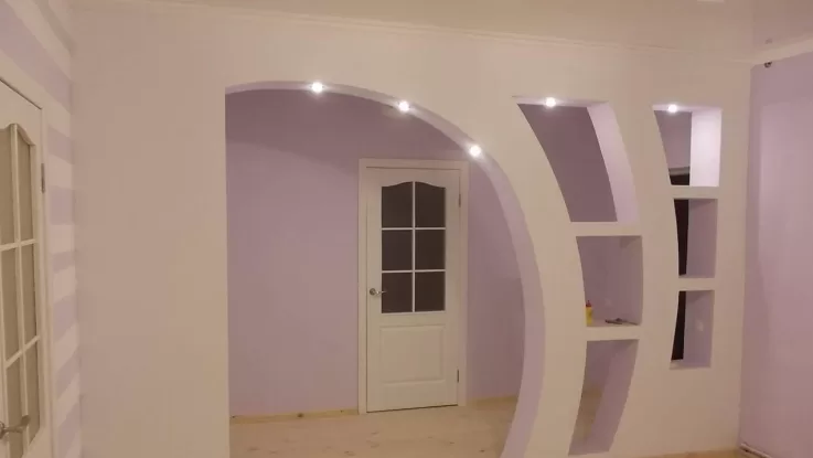 Арки из гипсокартона – это классика, которая никогда не выходит из моды. Они подходят для дверных проемов, коридоров или декоративных элементов над окнами. Благодаря гибкости материала можно создать как плавные полукруглые формы, так и сложные асимметричные конструкции. Монтаж прост: каркас обшивается гипсокартоном, швы обрабатываются, а затем арка красится или покрывается штукатуркой.