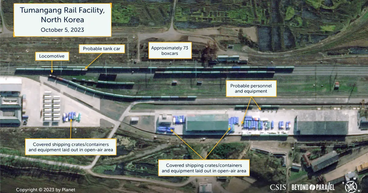 В частности, спутниковый снимок, датированный 5 октября, зафиксировал рекордное увеличение грузовых вагонов на железнодорожной станции северокорейского города Туманган на границе с Россией. Речь идет о 73 вагонах.