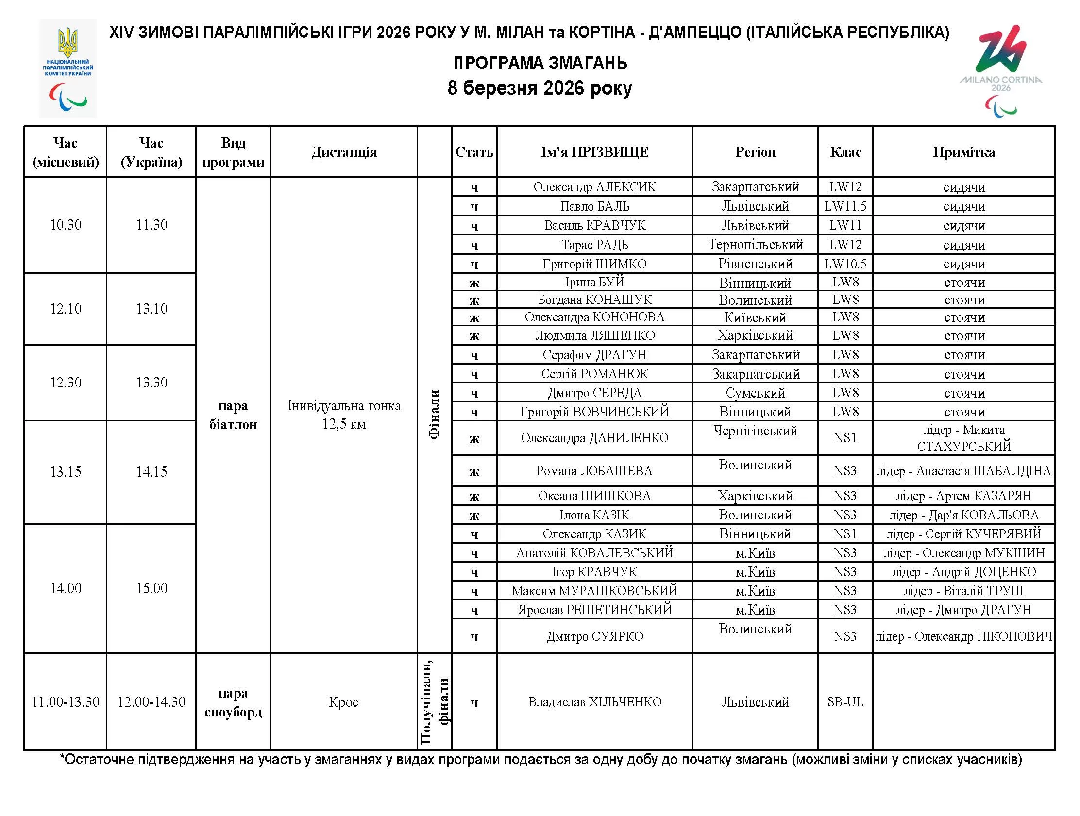 8 марта на зимних Паралимпийских играх-2026 в Милане и Кортина-д’Ампеццо украинские спортсмены будут соревноваться в парабиатлоне и парасноуборде. В программе дня — финалы индивидуальной гонки на 12,5 км в разных классах и полуфинал в сноуборд-кроссе.