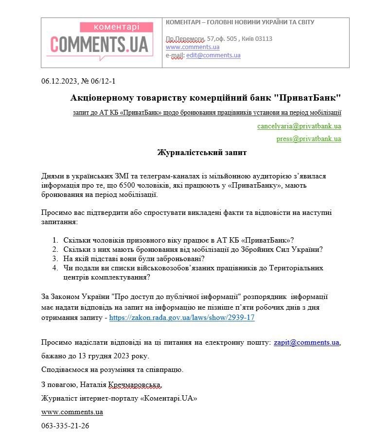 «Комментарии» просят «ПриватБанк» подтвердить или опровергнуть изложенные факты и ответить на следующие вопросы: