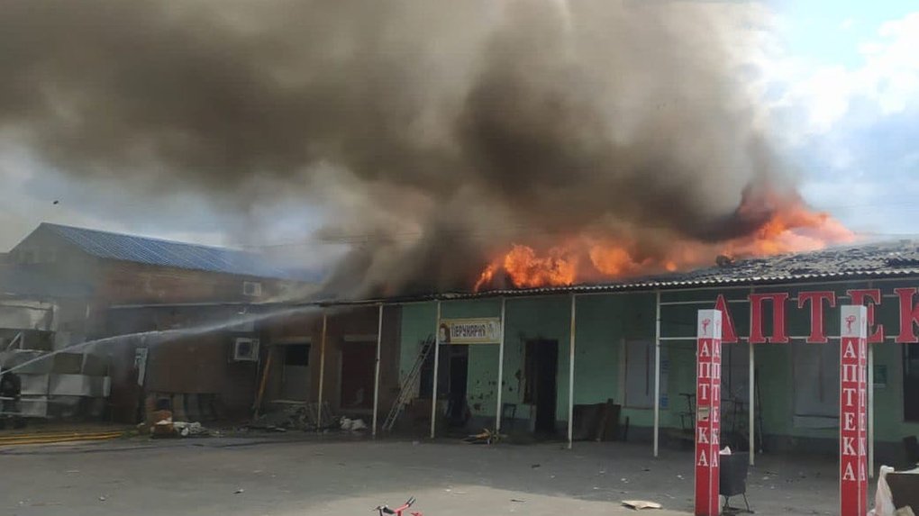 Еще пять торговых павильонов загорелись в 15.49 во время повторного обстрела рынка. Площадь этого пожара составила 1000 кв. м. Спасатели потушили огонь в 19:10.