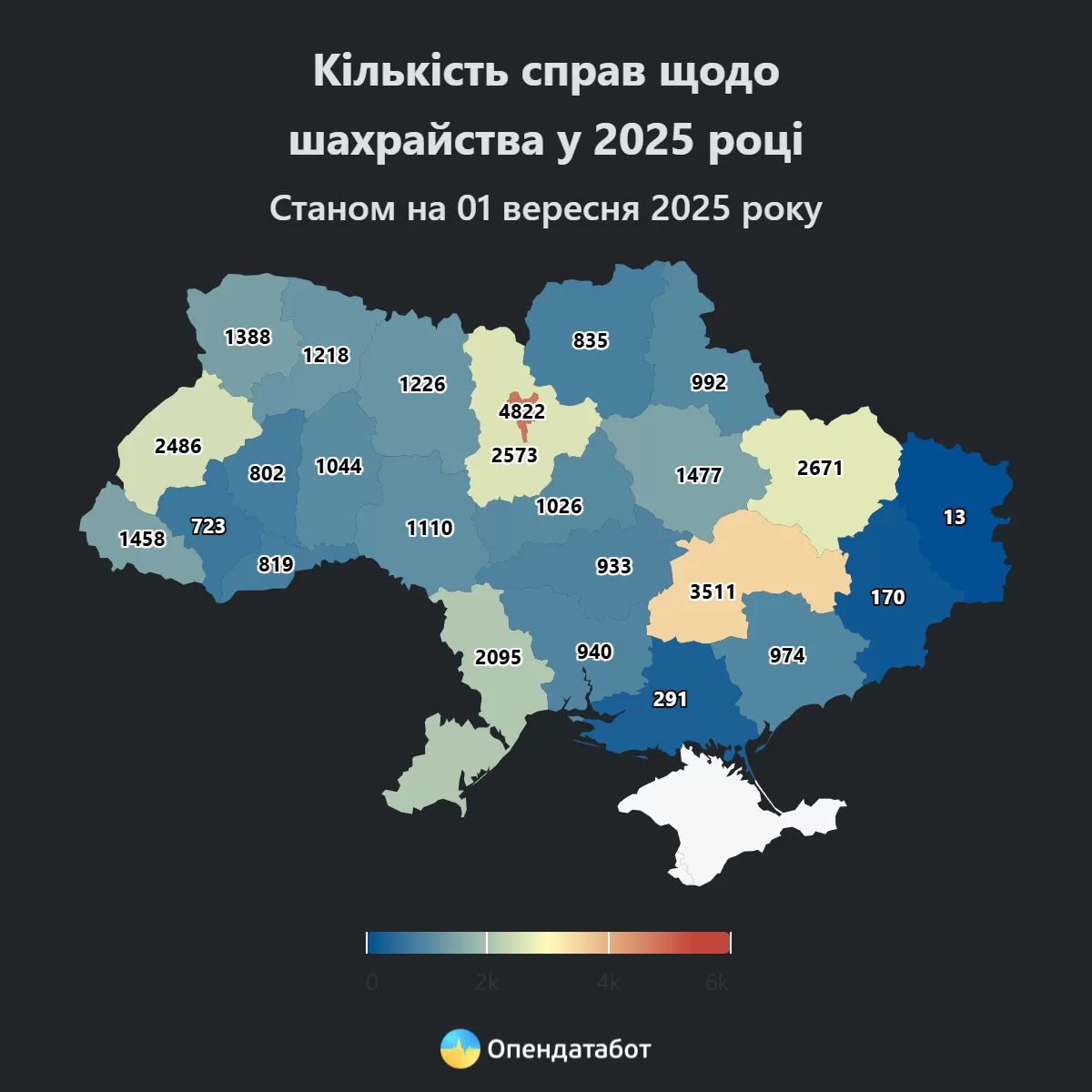 По данным ГПУ, за первые 8 месяцев 2025 года в Украине было открыто более 35 тысяч уголовных производств по статье 190 УК «Мошенничество». Это почти в 1,5 раза меньше, чем за аналогичный период прошлого года, но в 1,8 раза больше, чем в 2021 году.