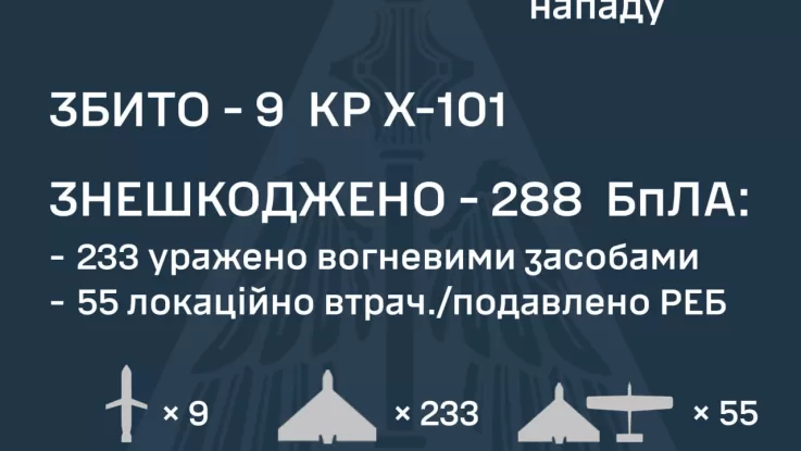 Как сообщили Воздушные Силы ВСУ, атака началась около 20:15 25 мая. Оборону неба обеспечивали подразделения авиации, зенитных ракетных войск, радиоэлектронной борьбы, беспилотных систем и мобильные огневые группы.