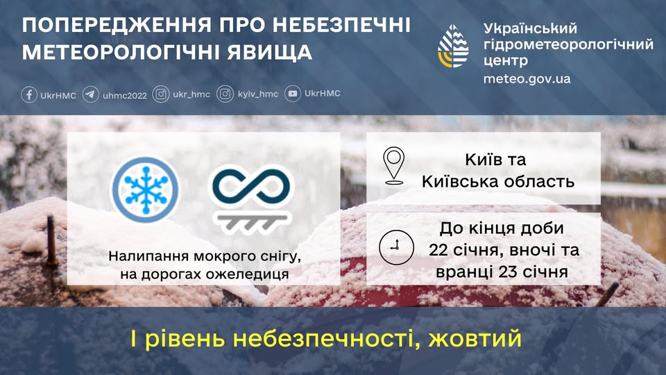 В Киеве и Киевской области синоптики прогнозируют опасные метеорологические явления. До конца суток 22 января, ночью и утром 23 января ожидается налипание мокрого снега, на дорогах гололедица. Уровень опасности первый — желтый.